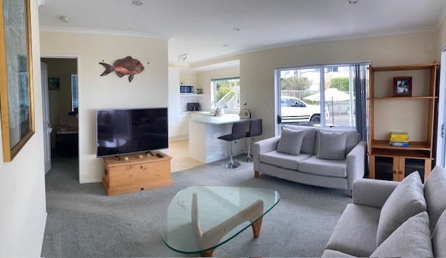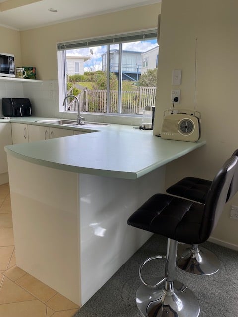 Panoramic views of Red Beach, Jacobs Ladder and Orewa with all-day sun! Green space outside for your BBQ; just pass the sauce through the kitchen window. Two living spaces upstairs. Two bedrooms on the first floor and internal access to another living space with laundry room, storage and room to sleep guests with another tv room downstairs. Parking for two vehicles.