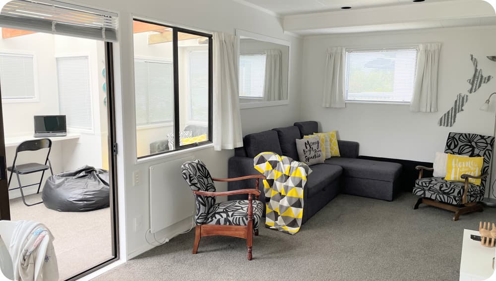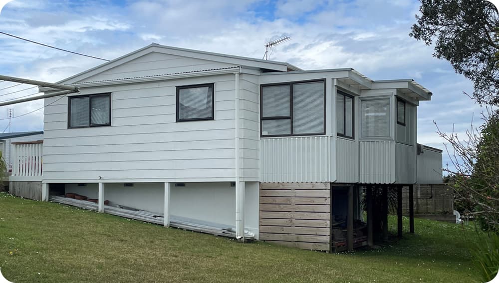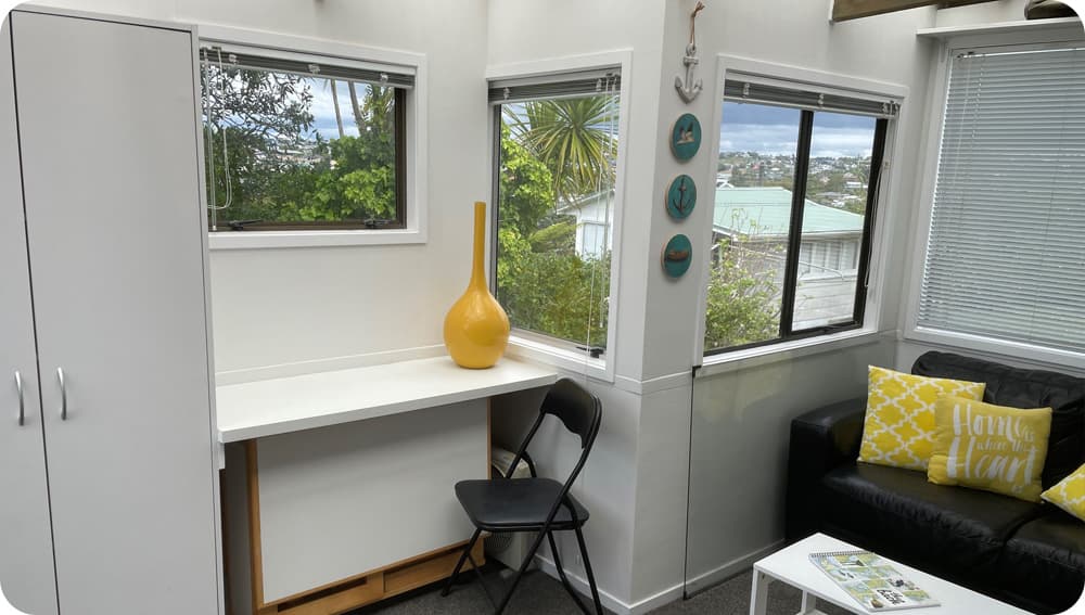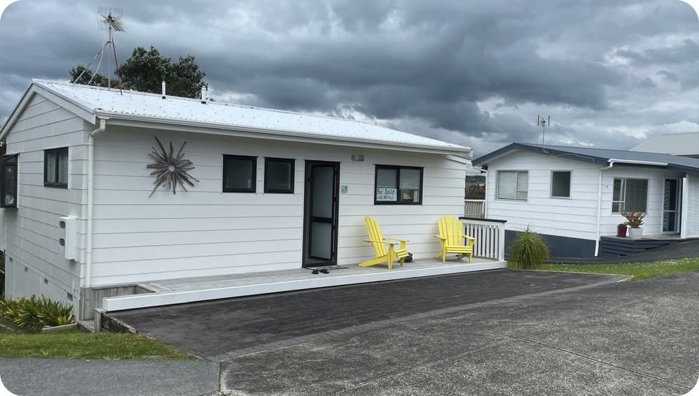 Built in Pantry and Linen Cupboard. Dedicated laundry area with ample storage cupboards within the Bathroom area. The separate conservatory has a built-in desk and storage cupboard, leading out to a spacious back deck for entertaining with gorgeous sea views while the newly built front deck provides ample parking. There is potential to further develop and dramatically increase the size of the Bach by developing underneath (currently used as storage) as per the Camp rules.