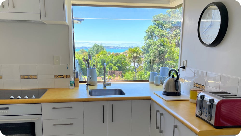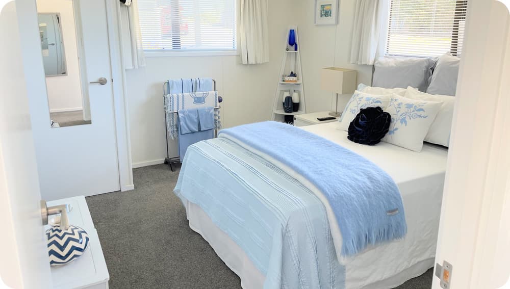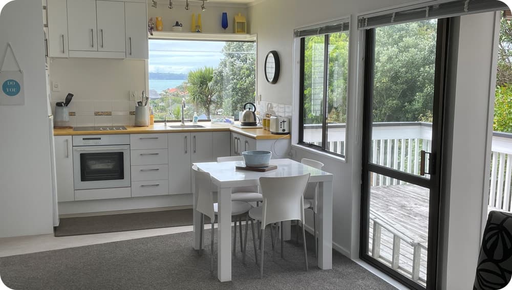 Beautiful 2 bedroom Bach with lovely sea views. Open Plan Kitchen, Dining, Living, Lounge with large wall mounted TV. Large double bedroom with wall mounted TV and Bunks in the second bedroom both bedrooms with built in wardrobes.