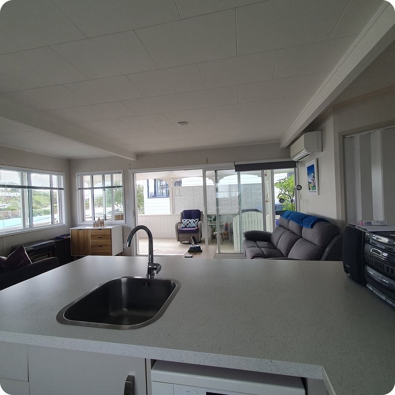 Heat Pump (heater/aircon), 2 carparks (tandem) and lovely sea views.