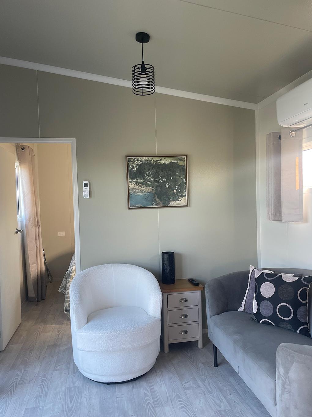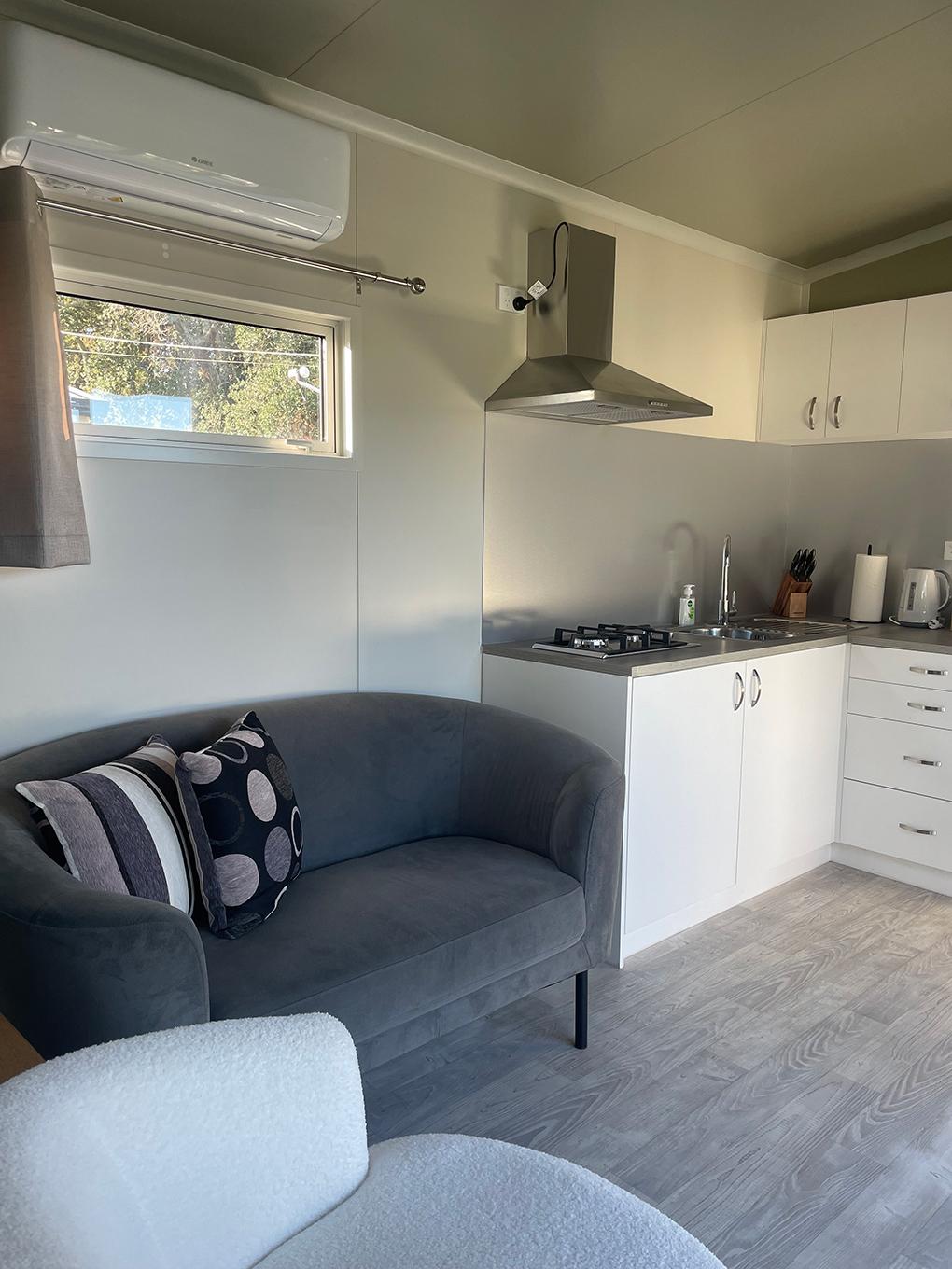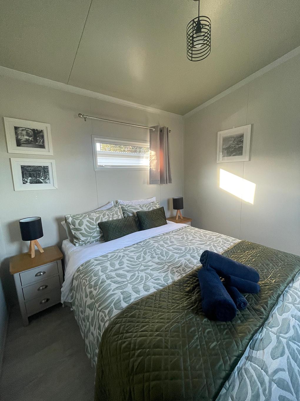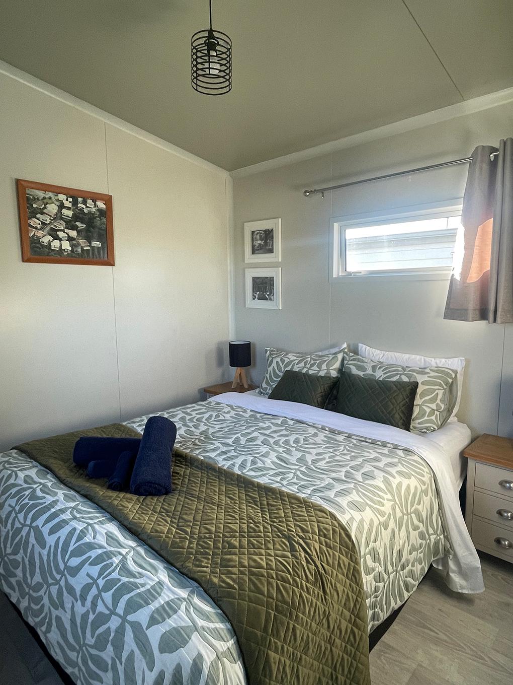 Our Tui Self-Contained Cabin has a small deck to enjoy the morning sun and has one bedroom, with a double bed. This includes a fully equipped kitchen with a washing machine and bathroom facilities.